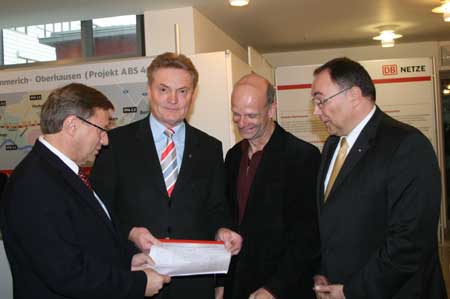 Holger Schlierf, Bürgermeister Hamminkeln, Manfred Flore, Sprecher der Oberhausener Bürgerinitiative „Betuwe, so nicht“, Harry K. Voigtsberger, NRW-Verkehrsminister, Rainer Latsch, NRW-Konzernbevollmächtigter der Deutschen Bahn, Stefan Ventzke, Planer der DB Netz AG (v.l.n.r.) |