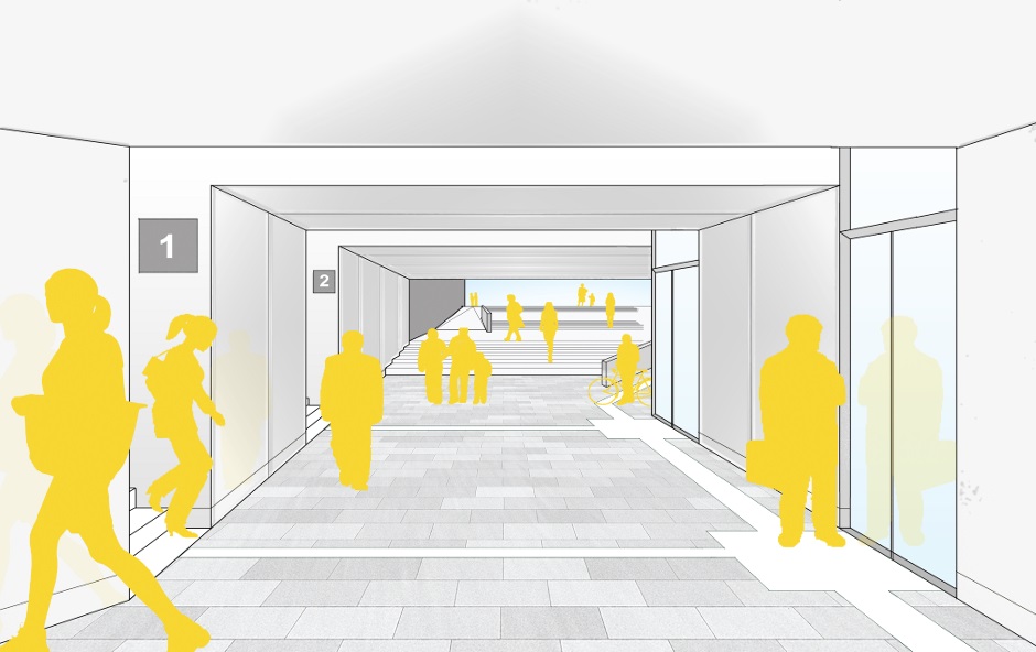 Bürgermeister Manfred Flore, zugleich Sprecher der Bürgerinitiative „Betuwe – so nicht", erinnerte daran, dass es gelungen ist, der Bahn einen Wettbewerb der Planer um die Unterführung abzuringen, und dass der Sieger dieses Wettbewerbs mit seiner Idee von den „Lichtwelten" auch tatsächlich zum Zuge kommen wird. Der Plan sieht vor, dass die Sicht auf die andere Seite teilweise möglich sein wird, vor allem durch die dann gut beleuchtete Unterführung. Die mündet auf der Westseite in Treppenaufgänge und Fahrradrampen. Im großen neuen Parkhaus, das an der Seite der Neumühlerstraße an der Stelle des heutigen, miserablen Parkplatzes gebaut wird, werden Rad-Abstellplätze angelegt. Zudem können dort Elektrofahrzeuge Strom tanken. Die neue großzügige Bushaltestelle an der Neumühlerstraße wird direkt vor die Bahnunterführung verlegt und erhält endlich auch eine Überdachung.